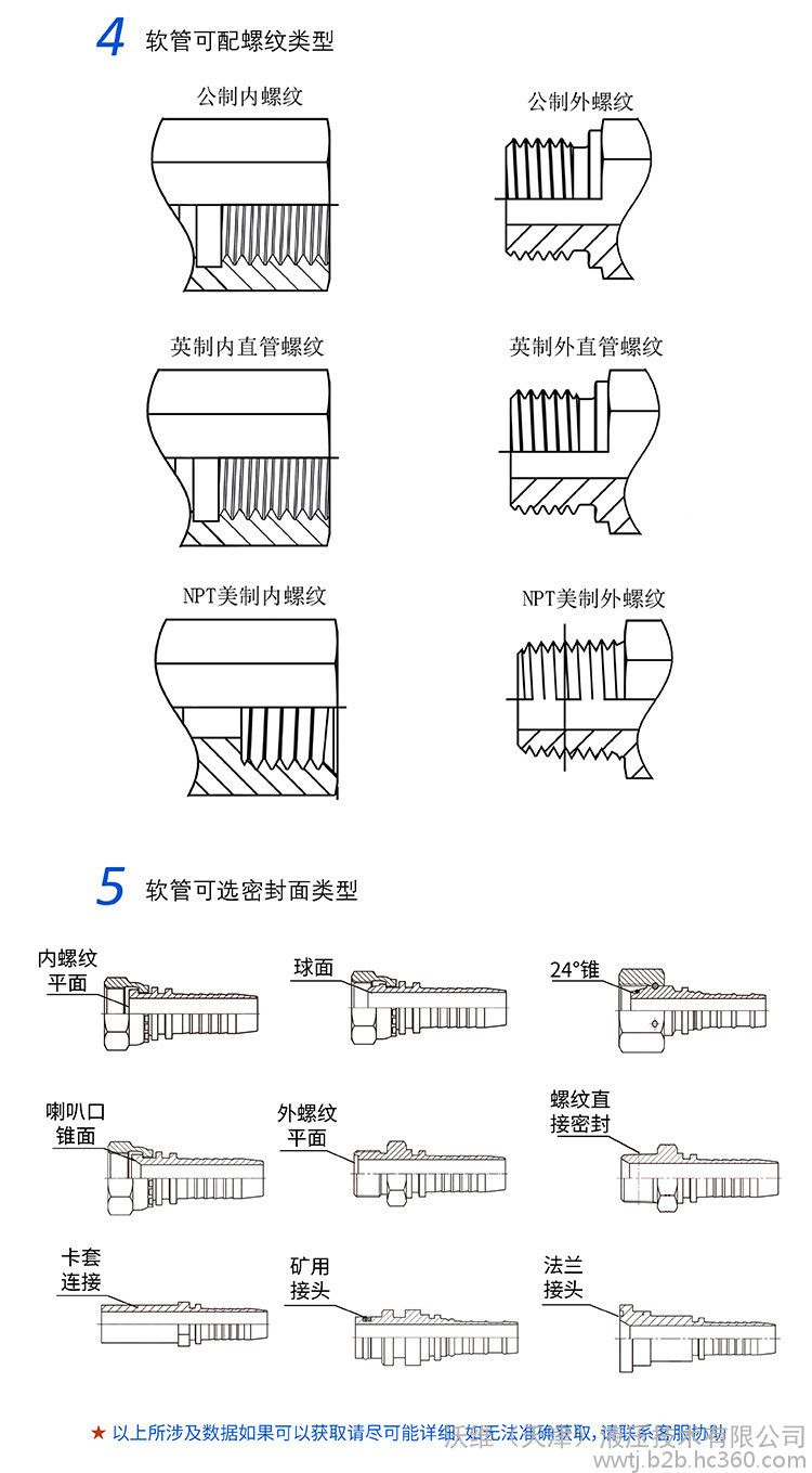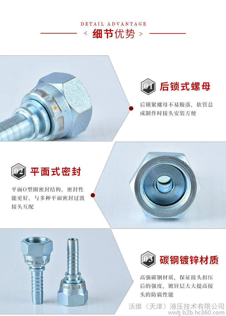 液压系统中管道和软管接头的连接方式也有不同,管道旋入端采用的是连接螺纹。锥螺纹凭借着自己的椎体旋紧并利用聚四氟乙烯等物质进行密封操作,主要被应用在中低压的液压系统中。细牙螺纹的密封效果非常好,经常被用于高压系统中,但它需要使用组合垫圈或者O型圈来针对端面的封闭工作,有时也会用到紫铜垫圈,它比较适合在连接管壁比较厚的管道中,其组成部分主要有接头体、接管和螺母。在使用时,将接头体嵌入目标中,配合使用前面所说的垫圈将端面密封,胶管接头体和接管之间用橡胶密封,有时也会使用球面密封的方式进行。