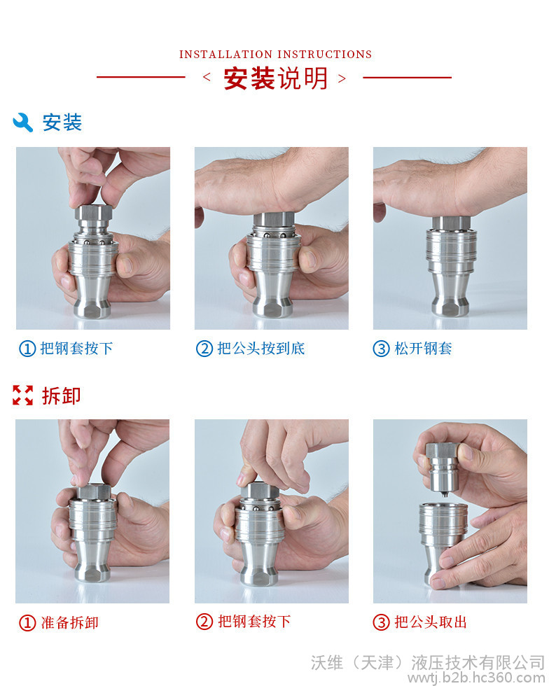 2、省油:折断油路时,快速接头上的单向阀可封闭油路,油不会流出,避免油液、油压损失。 3、环保:快速接头折断和连接时,油不会洒漏,保护环境。 4、设备化整为零,方便运输:大型设备或是需要便于携带的液压工具,使用快速接头分拆后运输,到达目的地后再组装使用。5、经济:以上各种优点都为客户创造了经济价值。