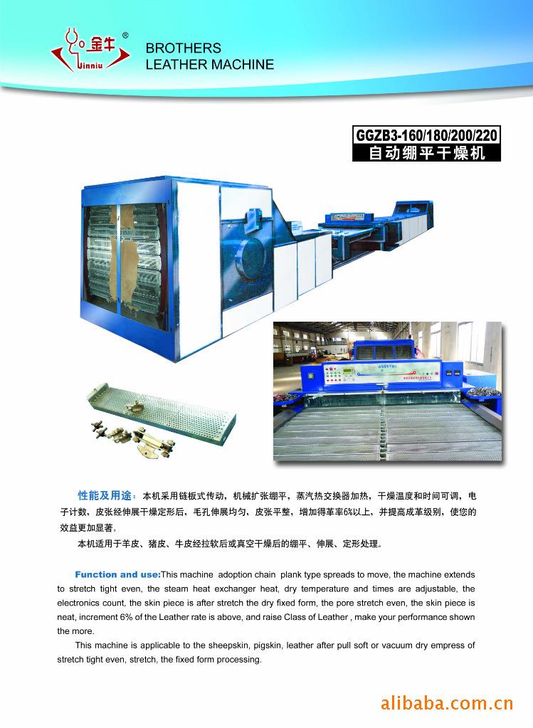 ??本公司专业生产皮革机械,目前主要产品有:皮革自动绷平干燥机\挂晾输送机\通过式滚筒熨平机\皮革自动喷浆机\旋转式自动绷平干燥机\自控框架绷平干燥机等皮革后整饰设备.