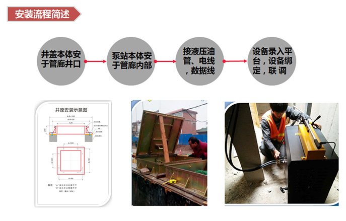 公司自主设计,专为综合管廊量身打造的远程控制井盖,采用液压驱动形式,由井盖本体结构系统、动力传输系统、动力输出系统、控制系统组成,可以在管廊控制中心或分中心实现对井盖的远程控制、完成井盖的开闭,同时具有现场遥控功能和手动应急开启功能。