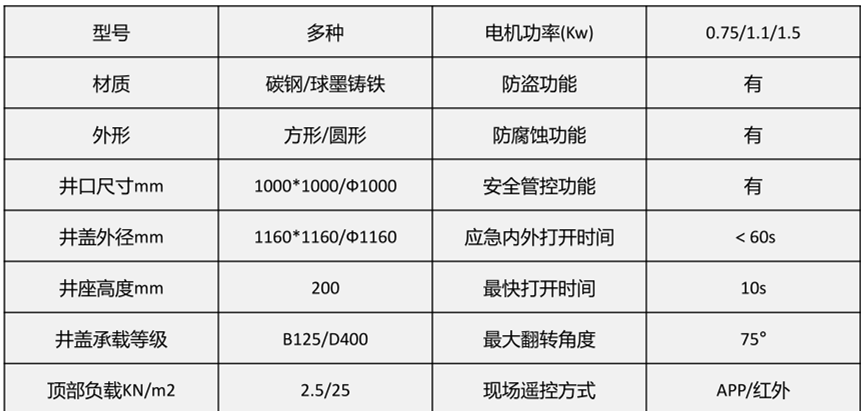??远程控制井盖主要用于综合管廊投料口、逃生口、检查口、支管井等。井盖形状一般为圆形和方形,尺寸除标准型号外,还可根据客户需求定制。