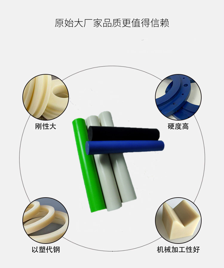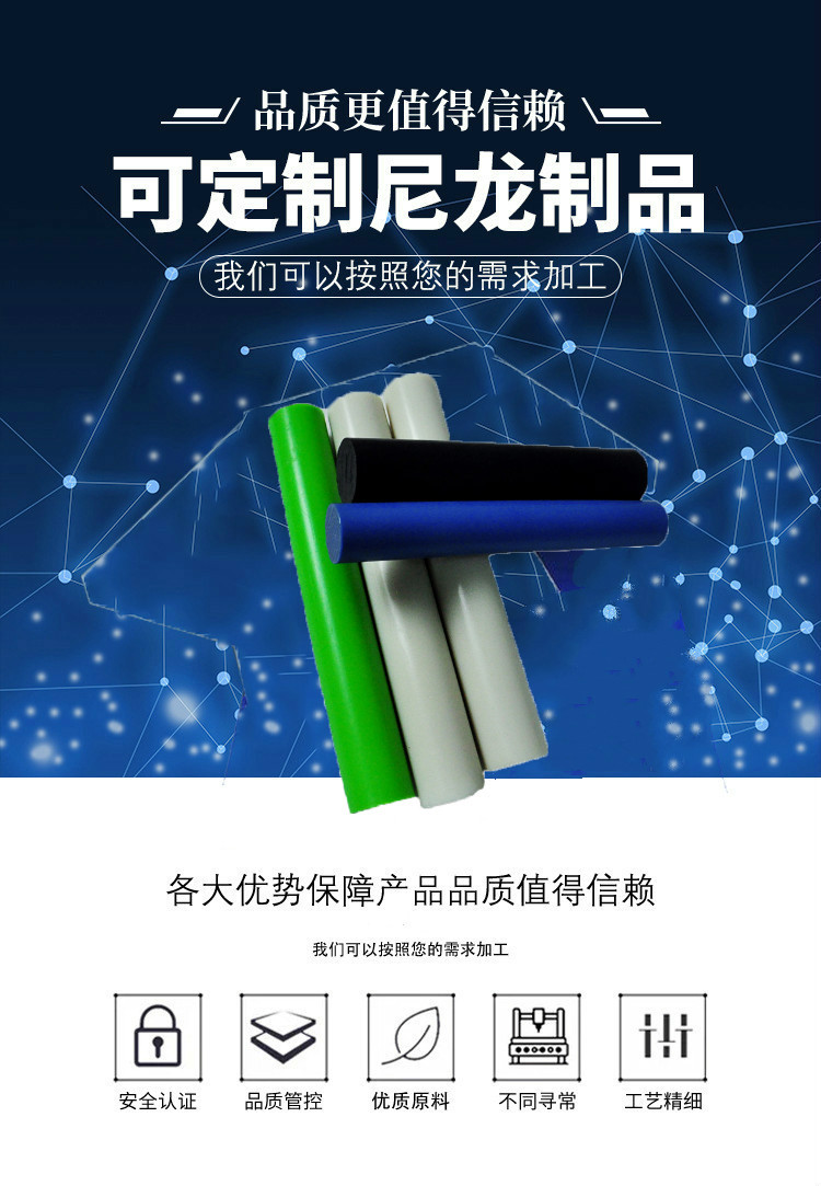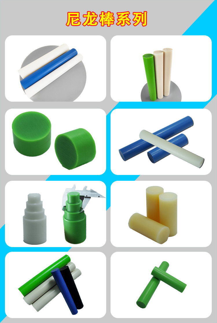 ??尼龙棒具有韧性好、耐磨力强、耐油、抗震、拉伸、弯曲强度好,并具有吸水性小、尺寸稳定性好等特点,因而被用来加工各种耐磨的高强度零件。产品用途广泛,是以塑代钢、铁、铜等金属的好材料,是重要的工程塑料;铸型尼龙广泛代替机械设备的耐磨部件,代替铜和合金作设备的耐磨损件。适用于制作耐磨零件,传动结构件,家用电器零件,汽车制造零件,丝杆防止机械零件,化工机械零件,化工设备。如涡轮、齿轮、轴承、叶轮、曲柄、仪表板,驱动轴,阀门、叶片、丝杆、高压垫圈、螺丝、螺母、密封圈、梭子、套简、轴套连接器等。