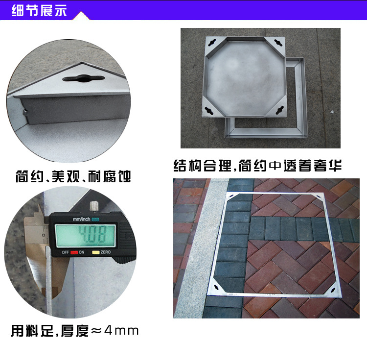 新型隐形井盖,由井框、井盖组成,井盖设计为方形的凹槽。其剖面也可为倒梯形,这样可使井盖与井框的配合更加紧密,改善了目前井盖的不足,隐形井盖只在地表面暴露四边边框,井盖的中间凹下一定深度,凹面的底部设计为弧形,凹面上设有加强筋。 轻型隐形井盖为钢板结构,表面直接可铺贴地砖。