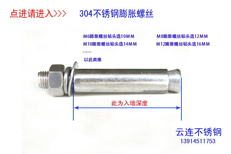 产品用途:304不锈钢膨胀螺丝适合在室外使用,广泛应用于防盗门窗,空调外架固定,家装,工程等。