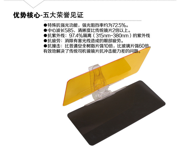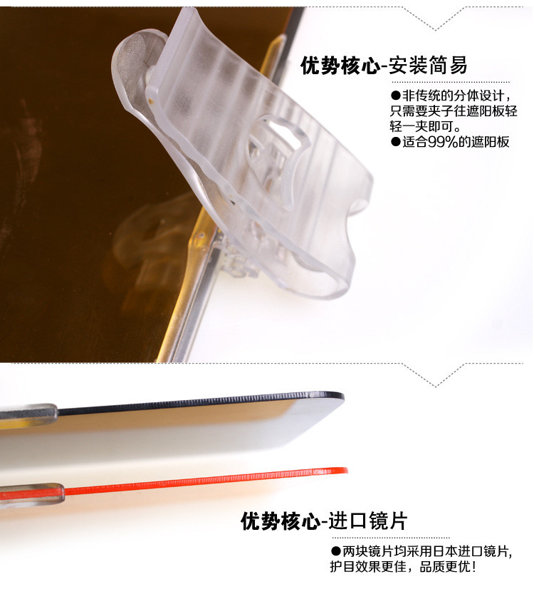 比市面上一般产品更宽更厚,产品特点:1、第五代全新设计,采用新型科技材料,护眼效果更出众;2、卡固式设计,防震效果好,保证行车安全;3、日夜两用,双效合一