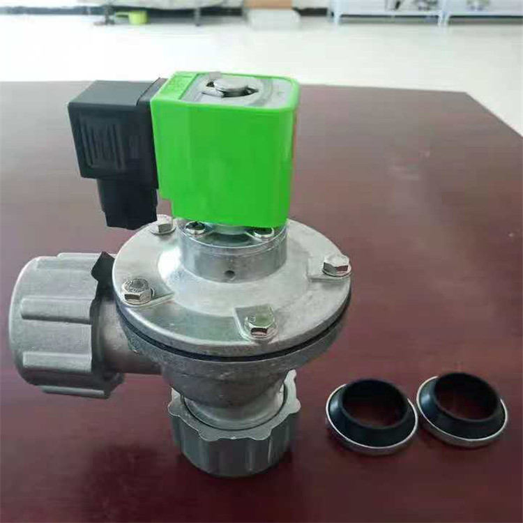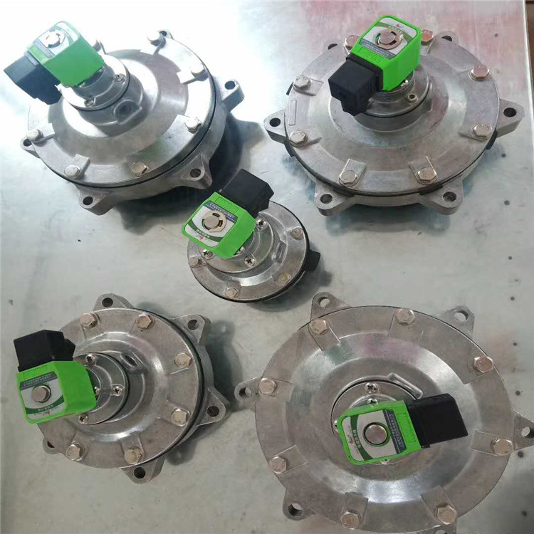 直角式电磁脉冲阀是脉冲袋式除尘器清灰喷吹系统的压缩空气“开关”;直角式电磁脉冲阀的阀体,阀盖采用铝合金压铸制成,经表面处理后,具有良好的防腐蚀性能。膜片及密封垫采用新工艺硫化和复合。电磁先导头选用磁性材料和不锈钢隔磁材料组成,弹簧和紧固件均采用不锈钢材料。分气箱(气包)的接管和除尘器的喷吹管分别插入阀的进出口。并拧紧二端压紧螺母密封。能提供从20、25、40S三种规格的阀供各种不同处理(净化)风量的脉冲袋式除尘器选用。阀体,阀盖压铸致密,表面覆盖透明漆,提高防腐蚀性能。膜片上的密封垫采用金属与橡胶复合,刚性好,不泄漏。