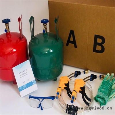 密闭罐由甲乙两组份组成,按比例均匀混合,经压气搅拌,通过喷枪均匀、连续地喷洒在目的物表面**能在短时间内发生反应,几秒钟后,即由液态变成固态,并在附着物表面形成泡沫塑料涂层;