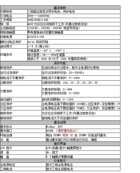 7、装置有多种软起、软停模式:限流软启动、电压线性曲线启动、电压指数曲线启动、电流线性曲线启动,电流指数曲线启动;多种停车方式:自由停车、软停车、制动刹车,软停+制动刹车,还具有点动功能。用户可根据负载不同及具体使用条件选择不同的启动方式和停车方式。完整的SPHMV系列软启动装置是一个标准的电机启动、保护装置,用来控制和保护高压交流电机。标准的SPHMV产品主要由以下部件组成:高压可控硅模块、可控硅保护部件、光纤触发部件、真空开关部件、信号采集与保护部件、系统控制与显示部件。