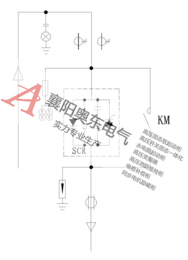 主功率单元主要由高压真空接触器和SCR可控硅阀组构成,其中高压真空接触器分进线接触器和旁路接触器,接触器的电压和大小根据电机电流和电压合理选用;进线柜接触器提供高压电源进线,可在有故障时迅速断开电源保护电机,旁路接触器用作起动完毕后其闭合完成起动,SCR可控硅阀组由可控硅串并联和RC吸收网络组成功;为了达到所有使用电网的峰值电压要求,可控硅组中每相是用多个SCR(具体数量根据用户不同电压等级来决定)串并联安装成一组,三组构成本相,允许各相模块可以便捷地单独进行维修和更换,RC吸收网络负责提供瞬间电压保护电器,以减少dv/dt冲击电压,防止SCR模块损坏。