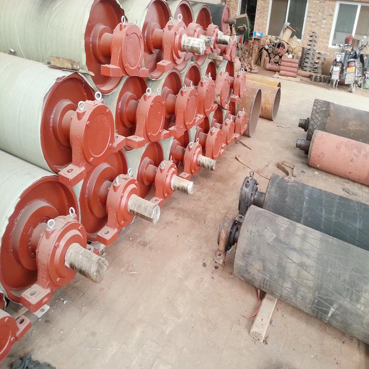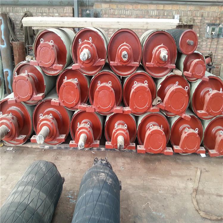 我们公司专业生传动滚筒,滚筒表面有光钢面、人字型及菱形花纹橡胶覆面。人字型花纹胶面摩擦系数大、排水性好,但有方向性,安装时人字尖应与输送带运行方向一致。双向运行的输送机要采用菱形花纹,用于重要场合时一定要选用硫化橡胶覆面;用于阻燃、隔爆场合应采用响应防爆措施。我公司生产的滚筒分为光面、包胶和铸胶滚筒三种。在功率不大,环境温度小的情况下可采用光面滚筒。在环境潮湿,功率大,容易打滑的情况下应采用胶面滚筒。其中铸胶滚筒质量较好,胶层厚而耐磨,推荐选用铸胶滚筒。包胶滚筒也可达到同样的使用性能,虽然使用寿命较短,但现场可以自行更换胶面,维修方便,经济耐用。轴承座分为整体式和分割式,并全部采用油杯,利于润滑脂润滑。我厂还生产更多托辊相关产品,完全可以满足你的需要。