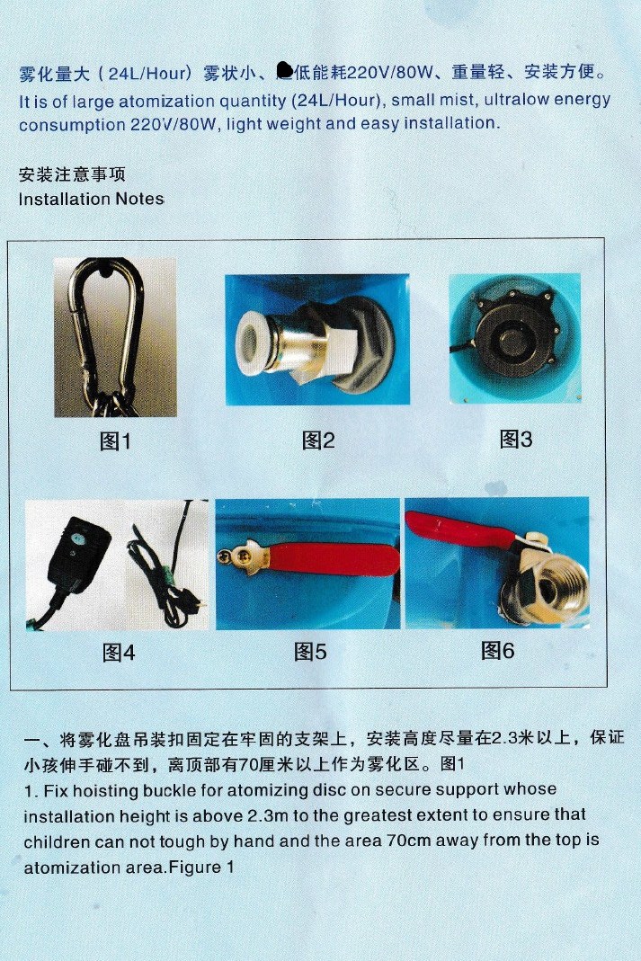 1号盘喷雾高些,2号盘喷雾宽些,本产品也可应用在于中央空调 加湿用(可在主风管底部开个孔安装在风管底部)