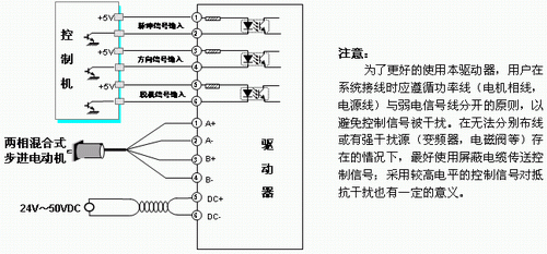 驱动器的信号输入采用可拔插的端子,可以将其取下,接好线后再插上。本驱动器的输入信号采用双端接口,可以满足共阴、共阳、差分等多种接口形式。