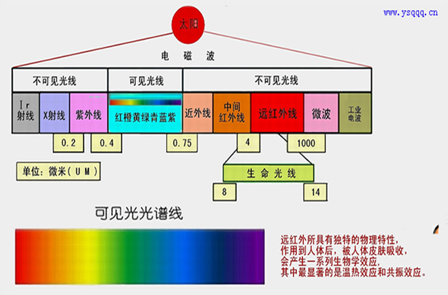 太阳光线大致可分为可见光及不可见光。可见光经三棱镜后会折射出紫、蓝、靑、绿、黄、橙、红颜色的光线(光谱)。红光外侧的光线,在光谱中波长自0.76-400微米的一段成为红外光,又称红外线。而在红外线中波长为4-16微米这一波段对人类的生存与万物的生长极为重要,被誉为“生命育成光线”称之为远红外线。远红外线是在所有太阳光中最能深入皮肤和皮下组织的一种射线,由于远红外线与人体内细胞分子的振动频率接近,故又被医学界誉为“生命光波”。