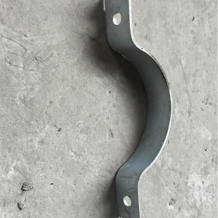 一种嵌入式抱箍,它是由左、右两半片抱箍对合后联接而成,左、右两半片抱箍均呈半圆环状,半圆环两端向外弯折,各