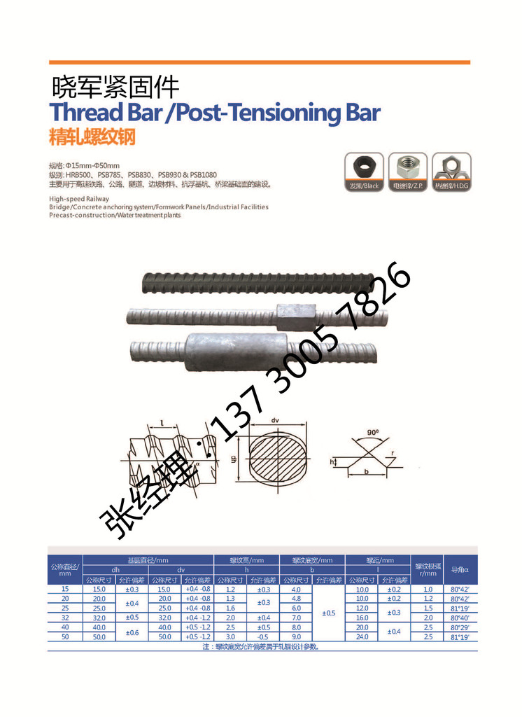 | 精轧螺纹钢筋 | Φ32 | PSB785 JL800 | 6.65kg/m | |||