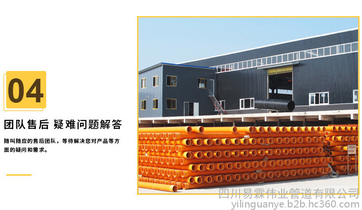 四川易霖伟业管道有限公司是一家集生产、研发、销售与安装为一体的新型管道技术企业。公司位于四川省彭州市致和镇复兴工业园。公司自成立以来,是一家专业生产HDPE塑钢缠绕管、中空壁塑钢缠绕排水管、内肋增强聚乙烯(PE)螺旋波纹管、HDPE增强缠绕B型管(克拉管)、HDPE钢带增强聚乙烯螺旋波纹管、钢丝网骨架复合管、PE给水管、MPP电力电缆保护管、玻璃钢电力护套管、玻璃钢夹砂给排水管、HDPE双平壁缠绕管、PVC电力电缆护套管、HDPE双壁波纹管、FRPP双壁加管波纹管、PVC-U双壁波纹管、塑料检查井的生产厂家。公司专注于新技术产品的开发、生产、销售;公司高度重视新产品的开发与应用,目前拥有国内水平生产线30多条(套),成立了自己的企业研发中心,拥有研发人员;产品适用于城乡市政、厂矿企业、化工行业的给排水、电力电缆、燃气等行业,为城乡环境保护、节能减排以及新农村建设提供了全方位的产品。