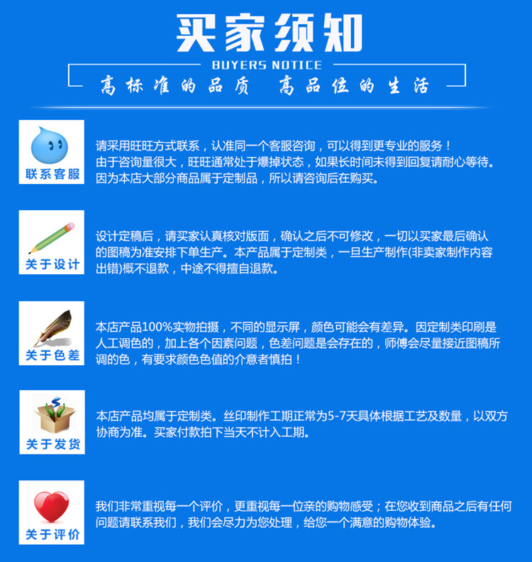 3.文件格式:接受CDR、AI、EPS、JPG、TIF、或者PSD格式文件(JPG、TIF、PSD文件分辨率300Dpi以上),所有文件色彩模式请设为CMYK模式。(较简单的版,可以直接传文字或者样版给客服免费排,排版后裁图方式给您确认。)排版裁图及文件传送之前请仔细核对稿件文字及图案的正确性,制版后将无法修改,按确认稿件印刷出来的成品,属稿件内容错误,本店不承担相应损失责任!