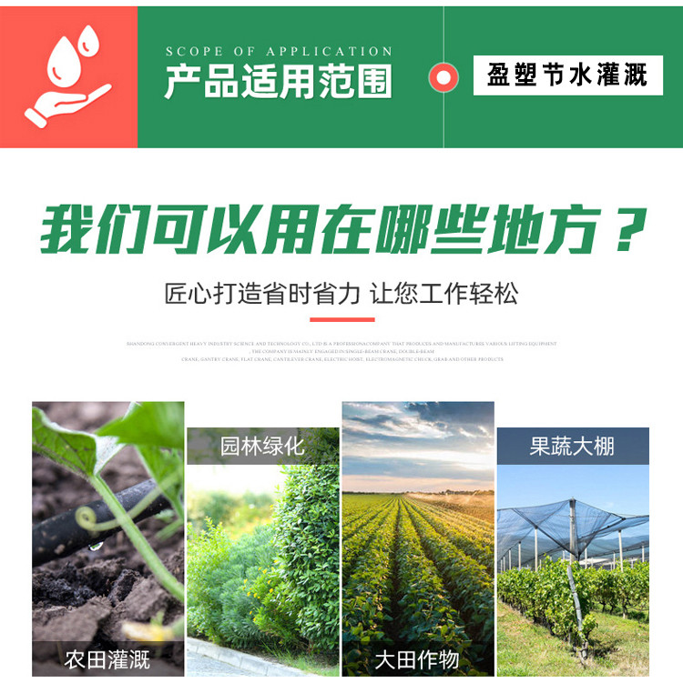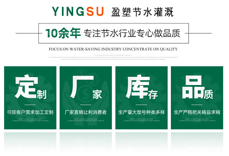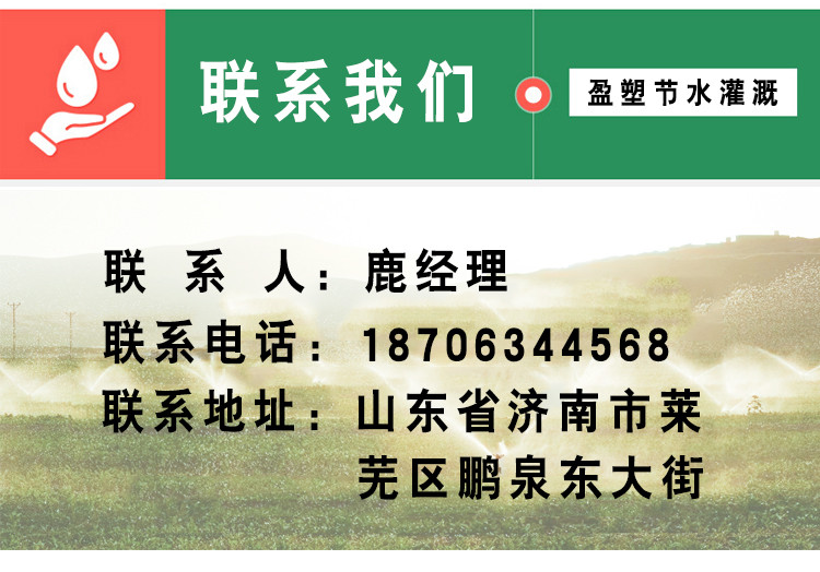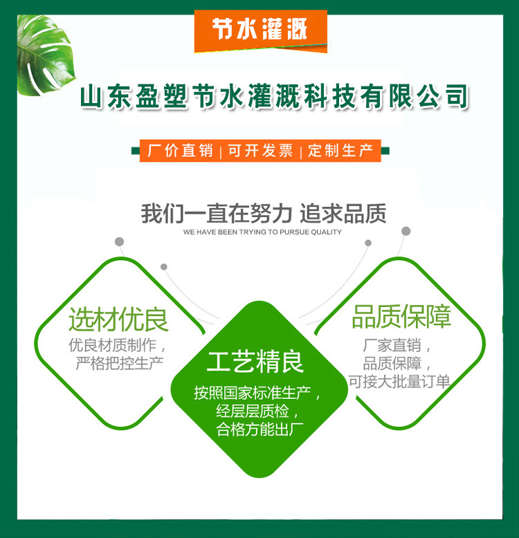 | 山东盈塑节水灌溉科技有限公司是PVC管、PE管、滴灌管、滴灌带、水带、吊挂微喷、地插微喷、喷头、过滤器、水肥一体机等产品专注生产加工的公司,有完整、科学的质量管理体系。山东盈塑节水灌溉科技有限公司的诚信、实力和产品质量获得业界的认同。欢迎各界朋友莅临参观、指导和业务洽谈。 |