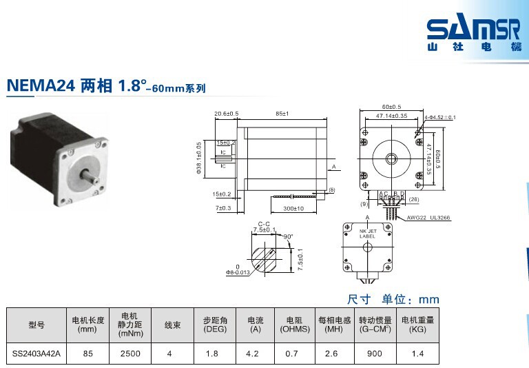 山社电机工业(株)式日本会社(SAMSR MOTOR)的步进电机,CE认证,产品均通过质量环保认证.采用永磁硅钢片及日本NSK原装轴承制造,低碳环保,定位精度高,输出力矩高,响应频率高,运行噪音低,动态特性好。产品广泛应用于自动化控制、精密机械加工、航天航空技术、消费产品、医疗器械、机器人、水下设施、纺织、半导体设备、包装机械、搬运机械及工厂自动化需要精确定位、高精度,自动瞄准,自动记录等的领域。