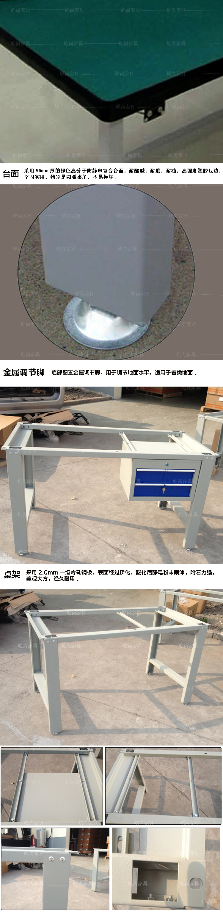 | 材质 | 台面**的高分子复合台面或防静电台面,钢架**的宝钢冷轧钢板,表面喷塑,管壁2.0mm |