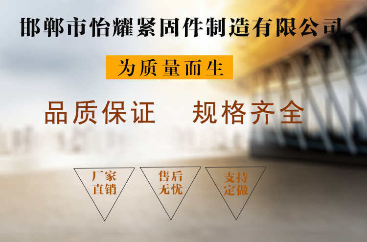 邯郸市怡耀紧固件制造有限公司始建于2016年,是一家专注于紧固件行业制造、咨询以及检测的高科技认证企业,是主要以生产和销售紧固件为主的公司,公司位于河北省邯郸市永年县。公司还拥有国内外先进的加工设备、各种检测设备,并建有可存放产品的立体仓库。本公司生产流程质量严格按照**标准和用户需求生产。 主要产品:地脚预埋螺栓(Q235B,Q345B,45#,35#,40Cr,35crmo材料等,长度和直径不限制)、U型螺栓、方U型丝、双头螺栓、六角螺母、羊眼圈、等国标紧固件。可定制加工各种非标异型件。 邯郸市怡耀紧固件制造有限公司的诚信、实力和产品质量获得业界的认可。欢迎各界朋友莅临参观、指导和业务洽谈。