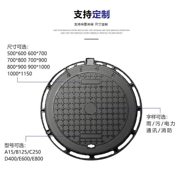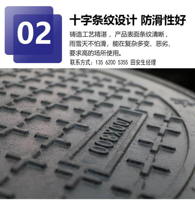 箅材质:是采用球墨铸铁QT500-7材质浇铸而成的产品,通过球化剂对于铸铁进行球化,使得铸铁结构结合更紧密,密度更高,强度更强,韧性更好。其综合性能接近于钢,性能优异。