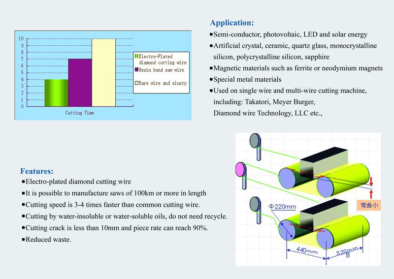 技术参数:1、线径:0.12~0.42mm,线径偏差≤0.01mm2、母线材质:切割钢丝3、金刚石颗粒度:5μm~60μm,可根据要求进行设计4、抗拉强度:3200~3400Mpa5、线长:可根据用户要求加工制造金刚石切割线特点:1、节约材料金刚石砂线的切割刀锋小,出片率高,节约了材料。2、切割精度可以达到材料切割精度要求,并且切割表面光滑,切割后可以直接抛光,省去了研磨工序,节约了时间和材料。3、切割速度金刚石砂线切割速度较快,大大增加了工作效率。4、没有崩边切割多种硬脆性材料,崩边基本小于 10mm ,可以减少内圆切割易造成的边缘或底部崩裂。5、减少环境污染切割时采用水切割,可以减少切削碎粉的污染,能够保持材料和设备工作环境的清洁。