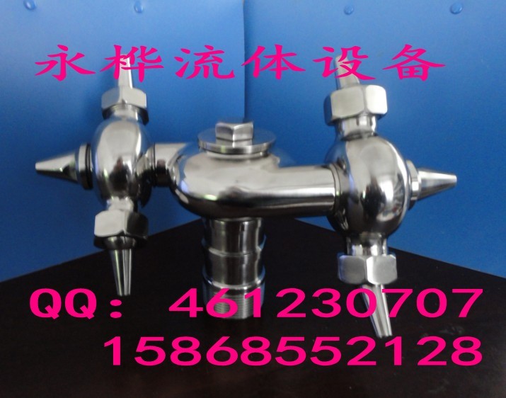 本产品工作时是以喷出的洗涤液产生反作用力推动洗罐器自动运转的。其工作原理是,一个横向副喷头产生的力矩推动所有的喷头绕垂直轴旋转,同时,喷头座上两个对称分布的副喷头产生的力矩推动喷头座绕横轴旋转,以实现主喷头喷出的液柱既绕垂直轴公转又绕横轴自转,使洗罐器呈360度喷洗无死角