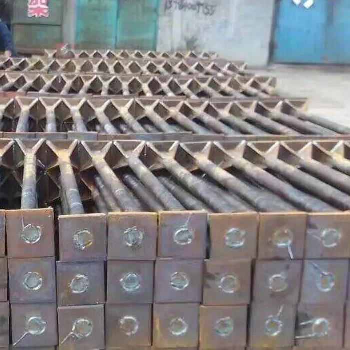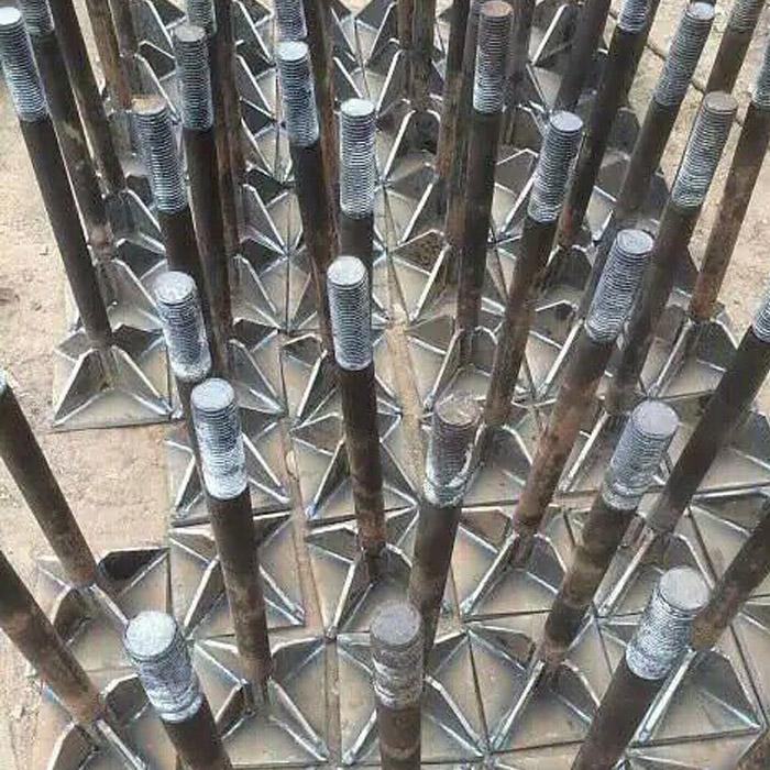 地脚螺栓的抗拉能力**是圆钢本身的抗拉能力了,大小等于截面面积乘以许用应力值(Q235B:140MPa, 16Mn or Q345:170MPA**是设计时的允许抗拉承载力。 地脚螺栓一般用Q235钢,即为光圆的。螺纹钢(Q345)强度大,做螺母的丝扣没有光圆的容易。对于光圆地脚螺栓而言,埋深一般为其直径的25倍,然后做一个120mm左右长的90度弯钩。 如果螺栓直径很大(如45mm)埋深太深的话,可以在螺栓端部焊方板,即做一个大头**可以了(不过也是有一定要求的)。埋深和弯钩都是为了保证螺栓与基础的摩擦力,不至于使螺栓发生拔出破坏。