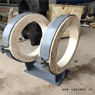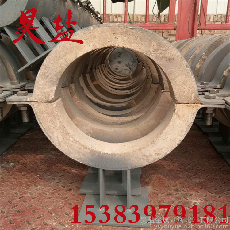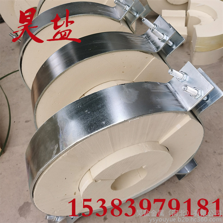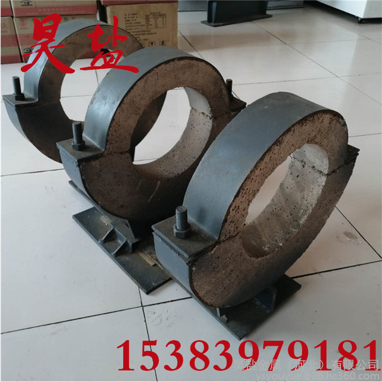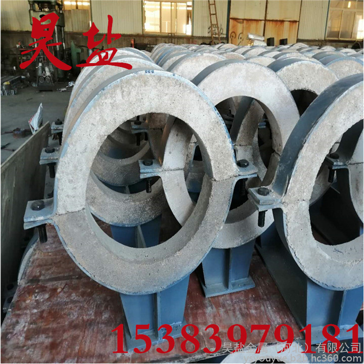 2、管夹内配有硬质保温层和软质保温层,其中管径在DN500以下,软质保温层厚度为20-30mm,硬质保温层为≥50-60mm,DN500以上为≥60-100mm,当温度t=250℃时,导热系数为≤0.2W/m.k,抗压强度为≥2.0Mpa。