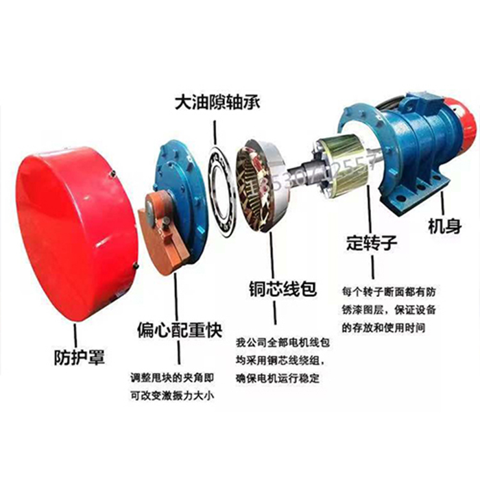YZS振动电机是动力源与振动源结合为一体的激振源,是在转子轴两端各安装一组可调偏心块,利用轴及偏心块高速旋转产生的离心力得到激振力。
