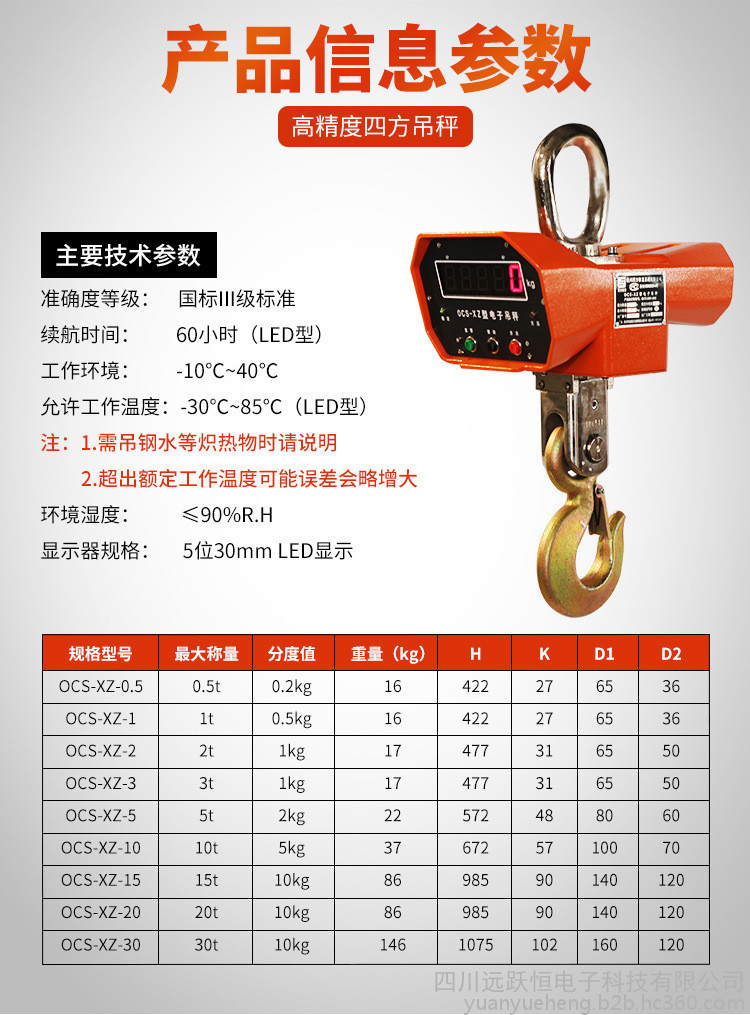 选购10吨无线电子吊秤 5T打印吊钩秤 20t吊钩电子称,在四川远跃恒**能买到,本司生产销售的电子吊秤是使物体处于悬挂状态进行其重量计量的衡器,该电子吊秤动态性能优良,即使在较强的晃动下也能迅速获得稳定准确的称重结果,此款电子吊秤5位LED数码显示字高30mm,超高亮设计,特别适合室内光线昏暗的场合使用;