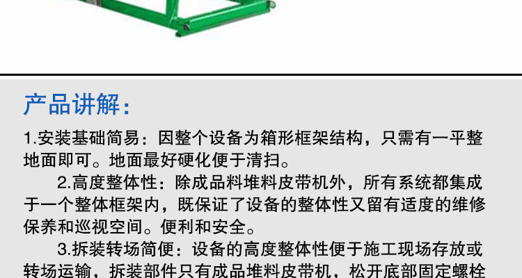 3.拆装转场简便:设备的高度整体性便于施工现场存放或转场运输,拆装部件只有成品堆料皮带机,松开底部固定螺栓和吊挂钢丝绳,将成品皮带机塞入主框架底面即可。