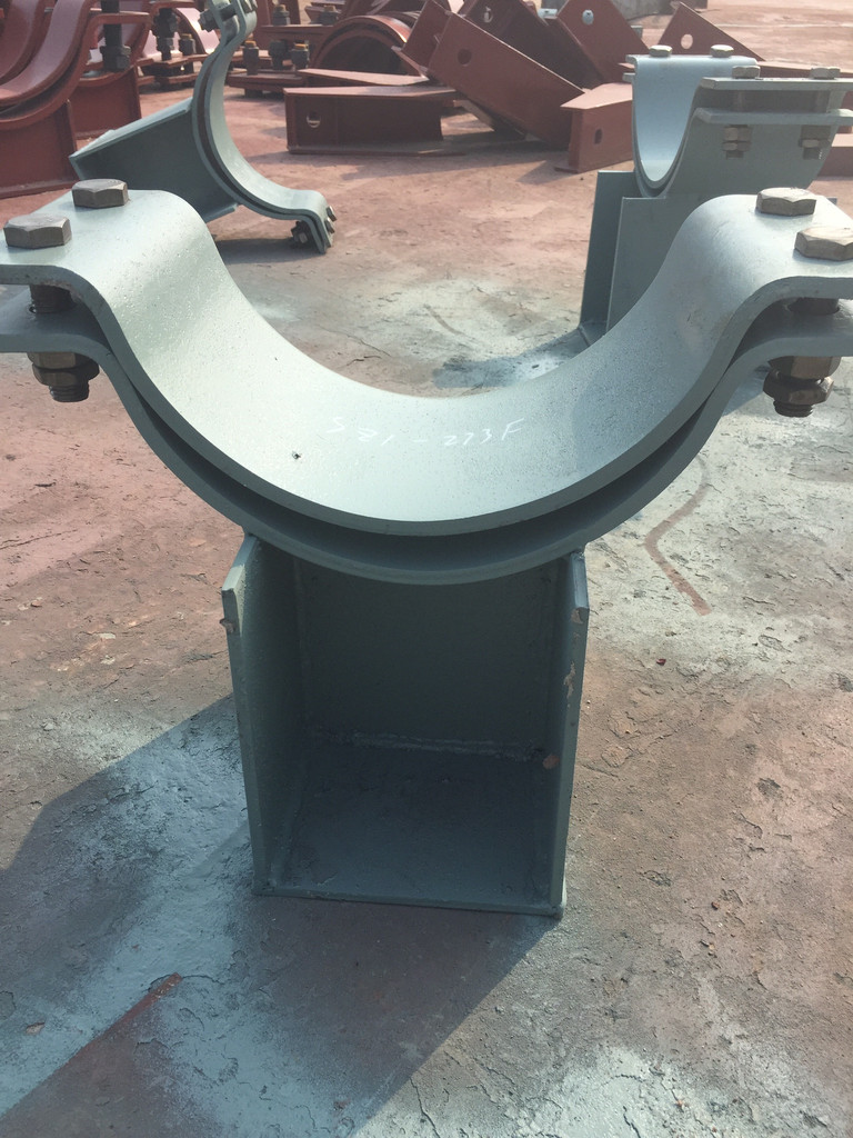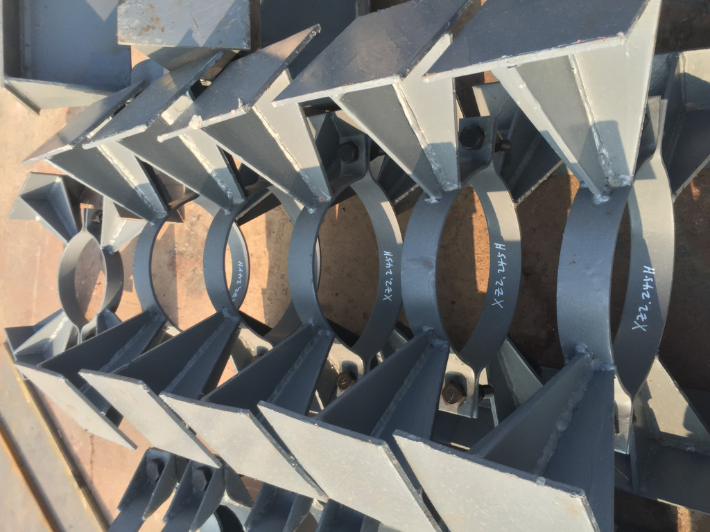宇正生产SZ1水平管道管夹支座,是华东电力设计院《火力发电厂汽水管道支吊架设计手册》中管部支架产品之一,该型式在设计上有三种:当管径≤DW76,温度t≤300°C时,产品结构组成为双螺栓管夹×1+工字钢;当管径≤DW76,温度t>300°C时,产品组成为双螺栓管夹×1+钢板焊接而成的T型托座;当管径>DW76时,产品结构为四螺栓管夹×1+钢板焊接而成的盒型底座。SZ1水平管道管夹支座的适用范围是t≤555°C,当t≤300°C时,主体材质为A3;当300°C<t≤450°C时,主体材质为20#钢;当450°C<t≤555°C时,主体材质为12Cr1MoV。当支座滑动面带有聚四氟乙烯作滑动材料时,应在规格中注明有“F”字样,聚四氟乙烯的厚度一般为1.5mm。标号示例:水平管管夹支座(带聚四氟乙烯),t=555°C,DW245,SZ1-H245F。该型式适用管径介于DW32-DW1020之间,如客户有特大管径需求,可予以设计制作。