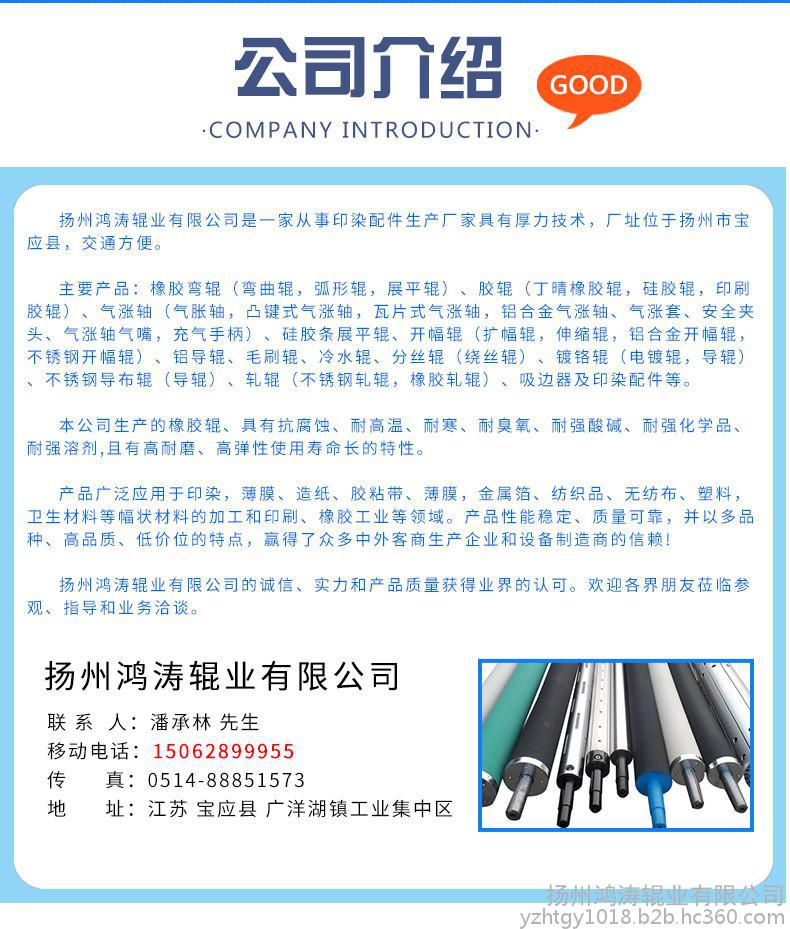 本公司生产各种胶辊,印染配件,薄膜机,真空镀膜机、各类涂布机、分切机、复合机、复卷机等机械配件,技术力量雄厚、加工设备精良、检测设备齐全。