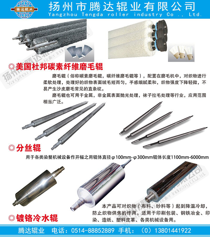 本公司生产各种钢辊,镀铬辊,特氟龙辊,各种导辊,不锈钢导辊,导布辊,冷水辊,胶辊,等系类辊筒。欢迎来电咨询或来我公司考察。
