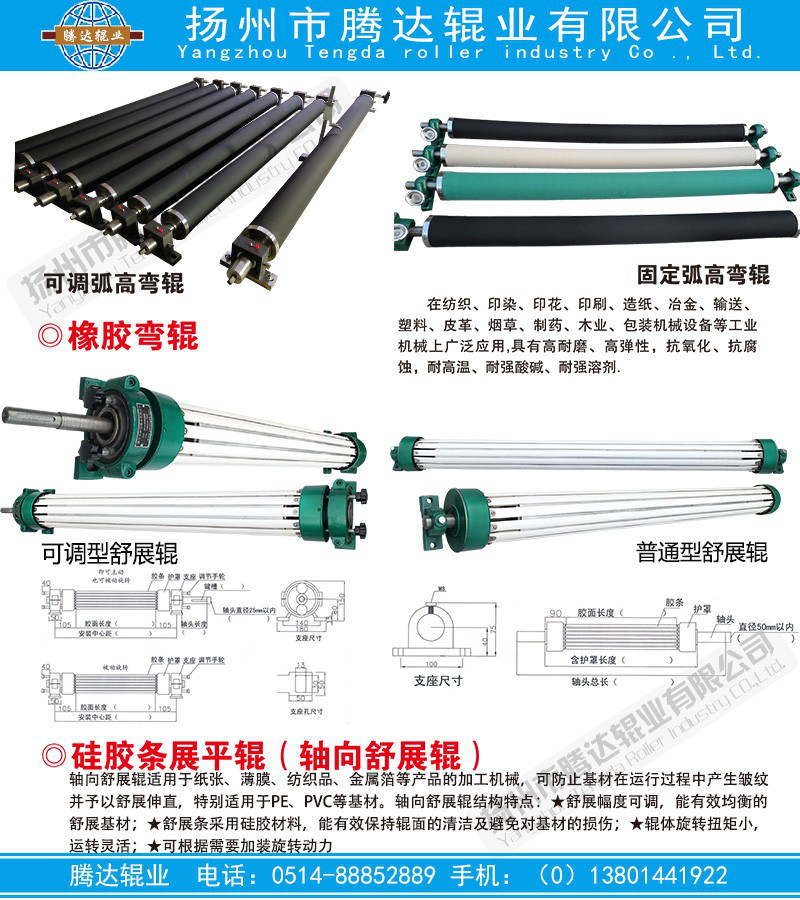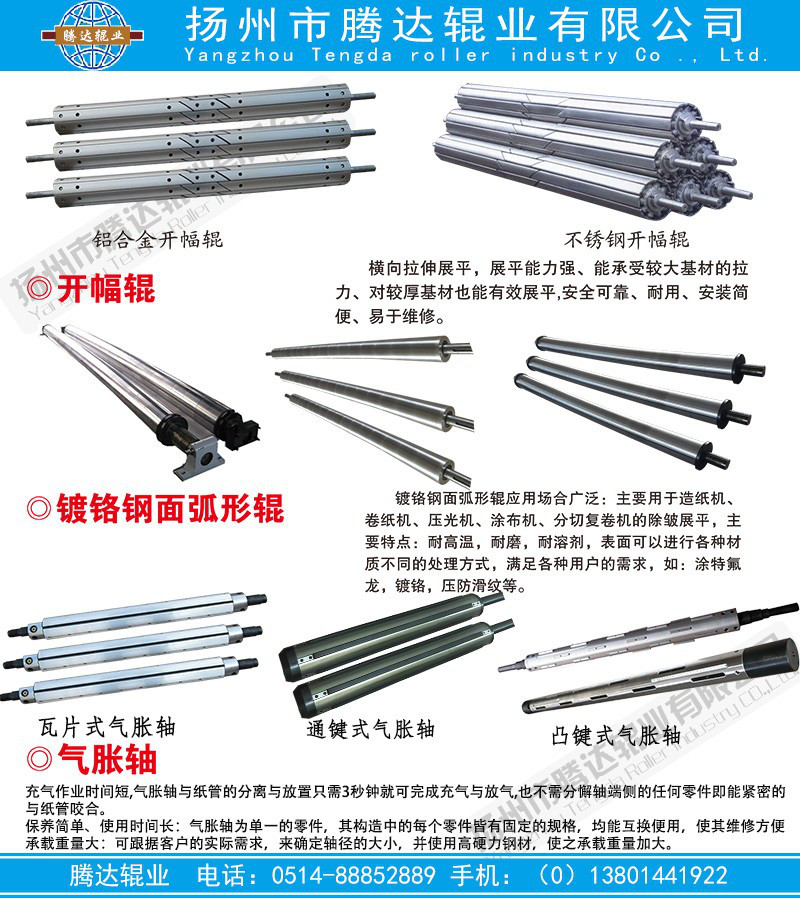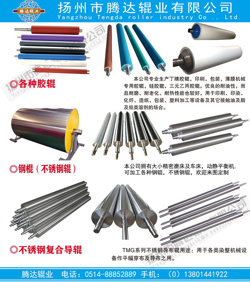 本公司生产各种钢辊,镀铬辊,特氟龙辊,各种导辊,不锈钢导辊,导布辊,冷水辊,胶辊,等系类辊筒。欢迎来电咨询或来我公司考察。
