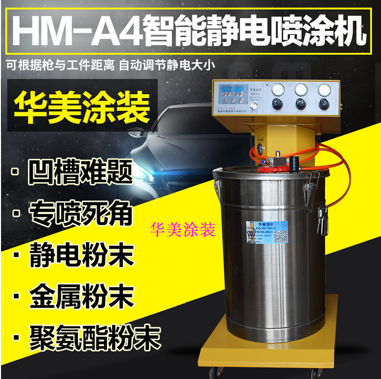 产品型号:华美-HM-2015-A4(智能液晶款) 所 在 地:中国 江苏 扬州华美涂装 特大优点:别家无与伦比的优点,枪与产品距离远近,都不会 影响喷涂效果,此款机器会自动调节静电大小,喷涂时根本不 需要有任何顾虑,更适合新手喷涂。 友情提示:下图是华美智能A4款静电喷涂机的工作效果图,不但自动往复喷涂效果好,手工喷涂效果也非常好,不管您是新手还是操作多年的老手喷涂师傅,只要您选择我们华美A4款的智能喷涂机,喷出来的产品效果是一样的棒,因为此款智能喷涂机,可以根据枪与产品的远近,自动调节静电与电压大小,可以为您的错误操作导致返工喷涂,节约了很大的成本。 华美喷涂机,喷涂机中的战斗机