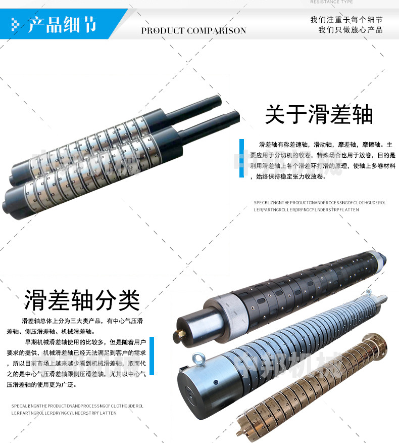 滑差环单元,采用定制模具合金钢,硬度强度、耐磨性、都是较好的,经过10余到工序后产品精度控制1丝以内,我厂滑差轴芯采用轴承钢,经过调制,校直后车床粗加工,外圆磨床后,上龙门4轴加工中心精密铣槽,然后精磨,电镀后再次精磨达到0.01,1丝以内的精度,才能算合格的滑差轴芯。详细工艺.热处理.调制.校直.车床.磨床.龙门加工中心.动平衡.磨床加工.表面处理.研磨.等工序,保证整根滑差轴芯和单元装配后,能很好的锁紧纸管,防止收卷中纸管的偏移,收卷轴张力得到很均匀的控制稳定,使用时保持张力转速稳定,这样分切出来产品平整顺畅光滑。