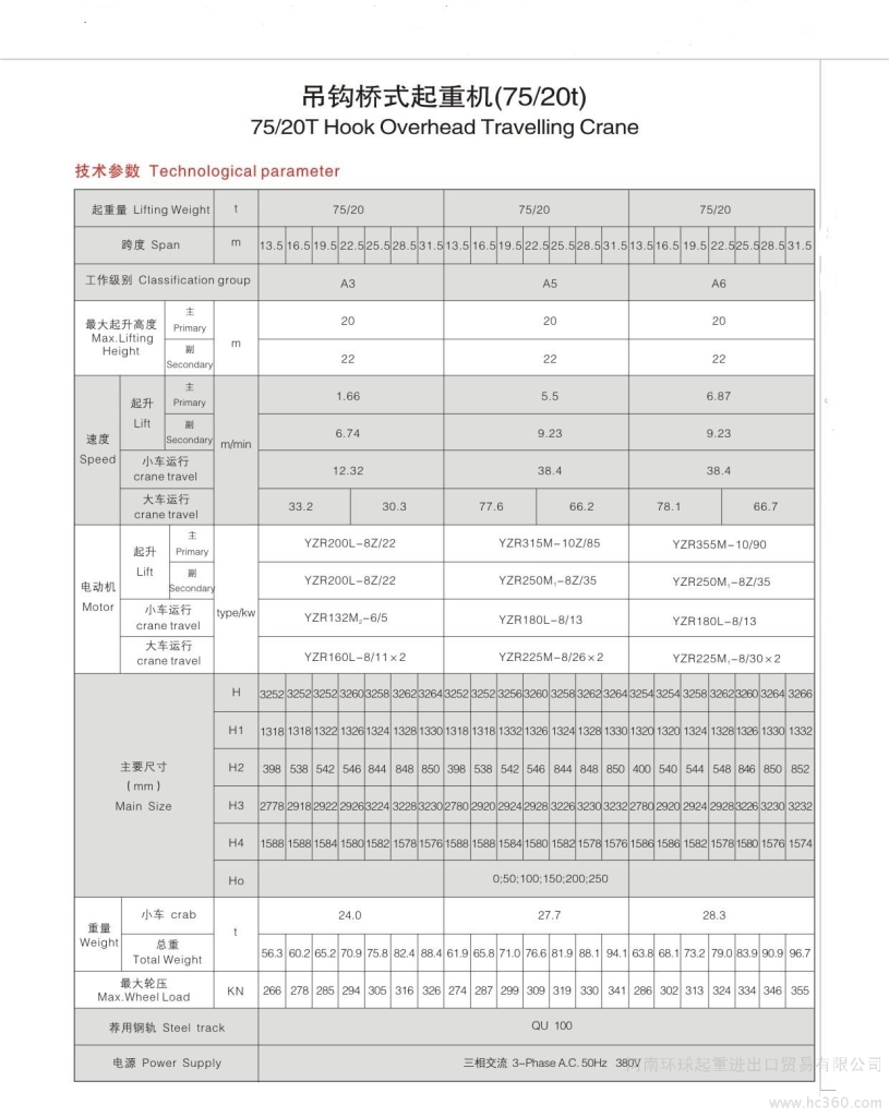 供应河南环球起重QD吊钩桥式起重机 50/10t 75/20t