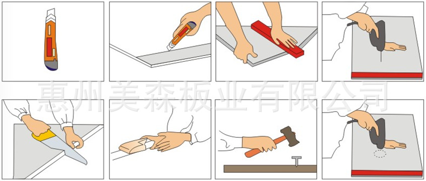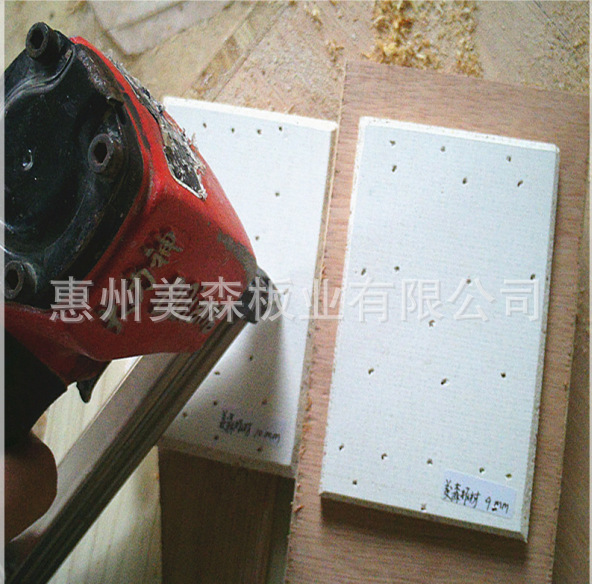 3、加工:玻镁防火板可以手锯、电锯、也可用美工刀直尺划痕折断。可以用铁钉、自攻螺丝、射钉枪或钻孔后固定。