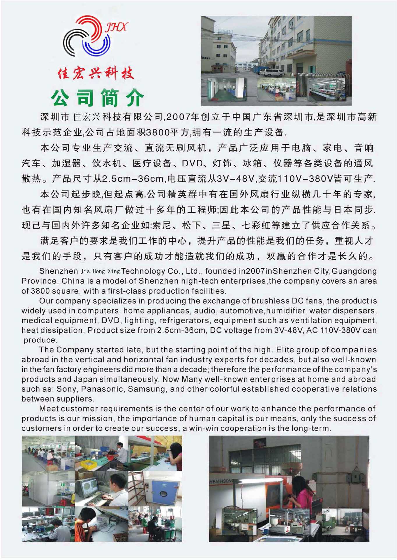 深圳市佳宏兴有限公司,成立于2007年07月份,坐落在风景秀丽、经济发达的广东省深圳市。公司自创立之初至今,一直在直流散热风扇、交流散热风扇和横流风扇行业耕耘发展,现已形成相当的企业规模、产品优势和品牌地位,公司拥有可靠的质量保证体系、检测设备和经营理念,用户遍布全国二十几个省市,产品远销美国,欧洲、东南亚、南美、中东和港澳台等**和地区。 直流散热风扇,交流散热风扇和横流散热风扇是公司的主导产品,在微型风扇和特殊功能要求风扇中做的**出色,如防潮、防水、涡轮增压、长寿命、低温升、低功耗、软起动、正反转、无极温控、PWM调速、RD报警和FG信号、超高电压(110V-220V)和超高电流**5A)的直流散热风扇等,产品广泛应用于:个人电脑,家电设备,电源设备,游戏机,汽车和飞机模型,音响设备及车载用品等。 为了适应国际市场需要,公司严格按ISO9001质量体系运行,确保产品的国际化品质,产品品质通过了UL 、CUL、 TUV和CE认证。 本公司技术力量雄厚,既拥有一批理论知识渊博,功底扎实过人的风扇专家、工程技术人员和管理人才,又拥有一批技术娴熟,训练有素的员工队伍,我公司将一如既往的竭诚为广大用户提供质量可靠,服务**的产品,立志在解决散热问题中作出应有贡献。