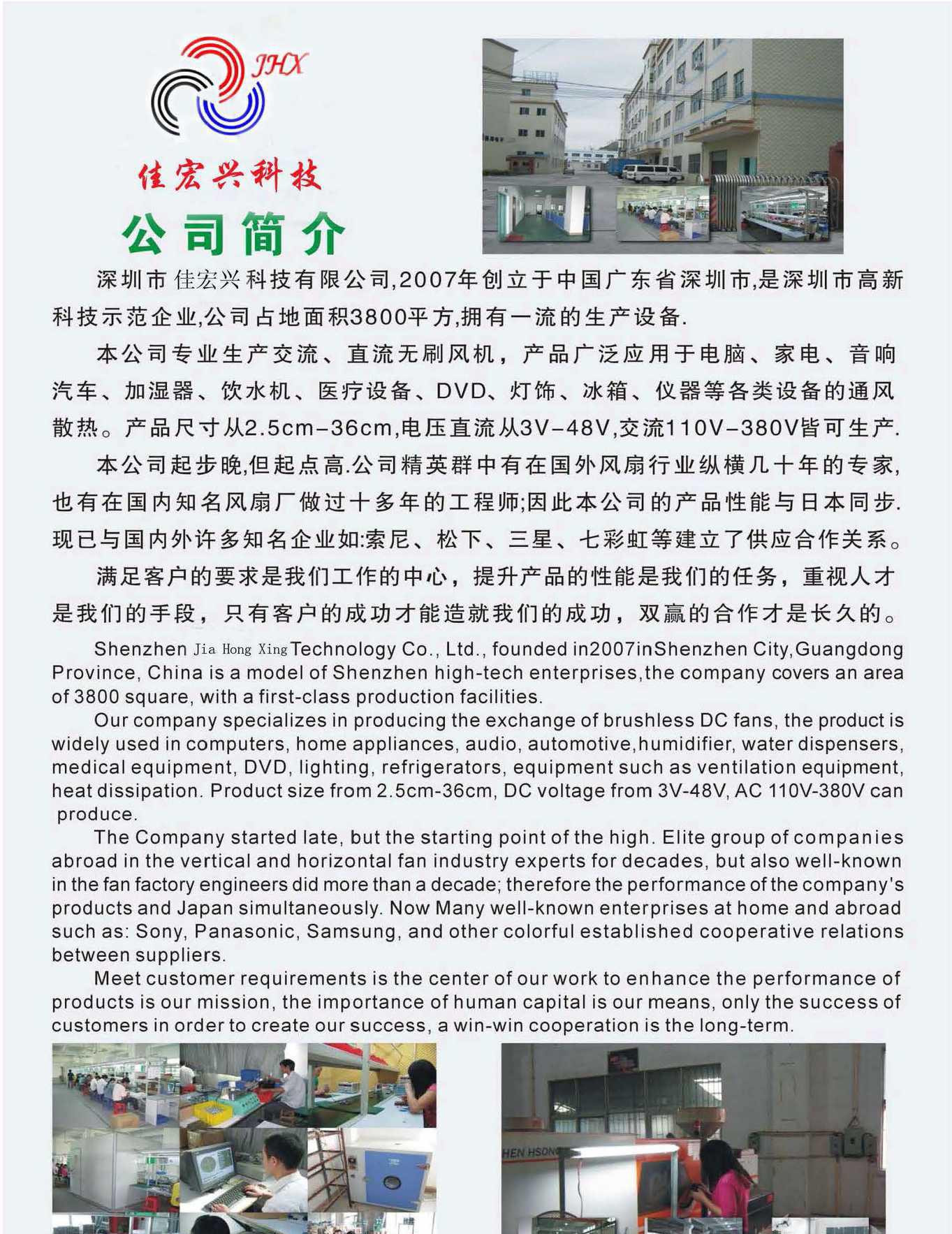 深圳市佳宏兴有限公司,成立于2007年07月份,坐落在风景秀丽、经济发达的广东省深圳市。公司自创立之初至今,一直在直流散热风扇、交流散热风扇和横流风扇行业耕耘发展,现已形成相当的企业规模、产品优势和品牌地位,公司拥有可靠的质量保证体系、检测设备和经营理念,用户遍布全国二十几个省市,产品远销美国,欧洲、东南亚、南美、中东和港澳台等**和地区。 直流散热风扇,交流散热风扇和横流散热风扇是公司的主导产品,在微型风扇和特殊功能要求风扇中做的**出色,如防潮、防水、涡轮增压、长寿命、低温升、低功耗、软起动、正反转、无极温控、PWM调速、RD报警和FG信号、超高电压(110V-220V)和超高电流**5A)的直流散热风扇等,产品广泛应用于:个人电脑,家电设备,电源设备,游戏机,汽车和飞机模型,音响设备及车载用品等。 为了适应国际市场需要,公司严格按ISO9001质量体系运行,确保产品的国际化品质,产品品质通过了UL 、CUL、 TUV和CE认证。 本公司技术力量雄厚,既拥有一批理论知识渊博,功底扎实过人的风扇专家、工程技术人员和管理人才,又拥有一批技术娴熟,训练有素的员工队伍,我公司将一如既往的竭诚为广大用户提供质量可靠,服务**的产品,立志在解决散热问题中作出应有贡献。