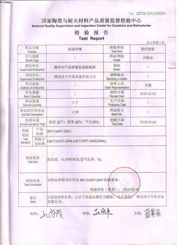 潍坊市格亿机械有限公司是一家以生产销售、技术咨询为一体的高新技术企业。公司联合多家脱硫设计院、环保公司,共同致力于脱硫喷嘴的设计、制造和测试。主要产品有碳化硅脱硫喷嘴,316L不锈钢喷嘴,氧化铝陶瓷喷嘴等。格亿公司至今已为上百座大型电厂脱硫系统、大型钢厂烧结机系统提供了性能优良稳定的产品,获得了客户的一致好评,在国内脱硫行业中拥有着良好的口碑。