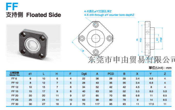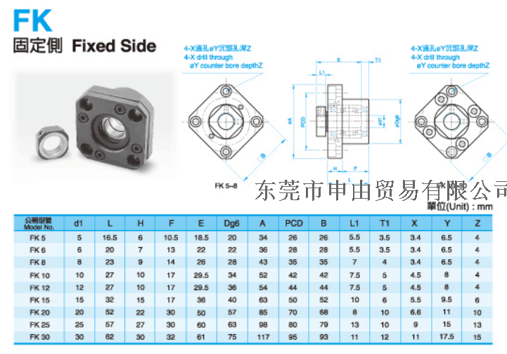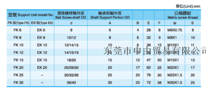 支撑座是连接丝杆和电机的轴承,构造与特长对标准滚珠螺杆库存品的轴端成品,预备了标准化的支撑单元EK、EF型,对一般滚珠螺杆预备了标准的支撑单元BK、BF型。固定侧的支撑单元装有经预压调整的JIS5级的角接触球轴承。特别是在EK6、8的超小型式中,装有为超小型滚珠螺杆所开发的接触角45°的超小型角接触球轴承,能获得高刚性、高精度的稳定的回转性能。