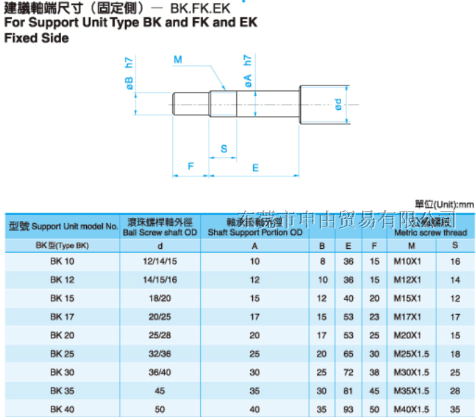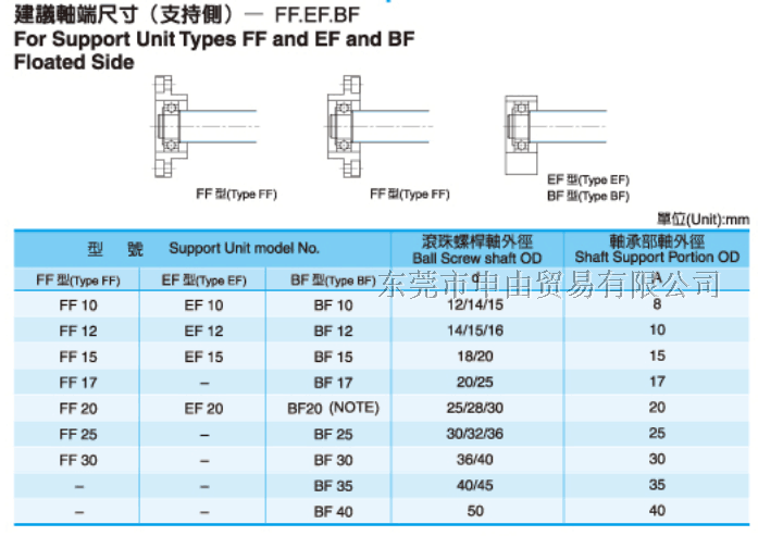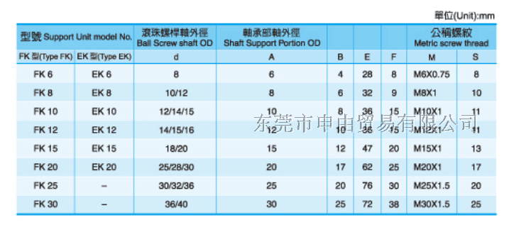 支撑座是连接丝杆和电机的轴承,构造与特长对标准滚珠螺杆库存品的轴端成品,预备了标准化的支撑单元EK、EF型,对一般滚珠螺杆预备了标准的支撑单元BK、BF型。固定侧的支撑单元装有经预压调整的JIS5级的角接触球轴承。特别是在EK6、8的超小型式中,装有为超小型滚珠螺杆所开发的接触角45°的超小型角接触球轴承,能获得高刚性、高精度的稳定的回转性能。