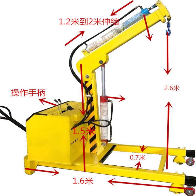 小型移动液压小吊机可定制1吨、1.5吨、2吨,电动提升装置可选用220V、380V、24V、12V四种型号电压,可根据使用现场电压来进行选择。液压小吊机吊臂可进行伸缩调节,定制长度为2米、2.5米、3米,吊臂长度不能超出3米,吊臂越长吊运的公斤数量**会减少。 液压小吊机底座部分有4个轮胎与两个支撑,支撑带有2个滑轮,滑轮起到平衡的作用,并且电动提升装置分为使用电压220V、380V、24V、12V,并且可无线遥控操作。单相小型起重机一台也是批发价