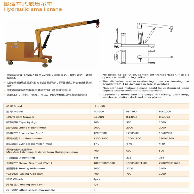 小型移动液压小吊机系我厂引进国外技术,继手动系列之后,研制开发了电动系列的液压发动机吊车,它具有结构合理,操作方便,外形美观,并可以通过机械传动,进行带重物旋转启吊,新颖移动灵活,吊装平稳,工作安全可靠等特点。