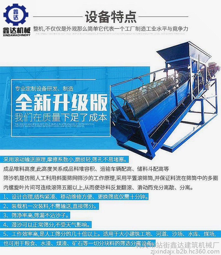 3. 河沙筛沙机设备噪音低:设备在运行中,物料与旋转筛网所产生的噪音完全由密封防尘罩隔离,使噪音无法传递到设备外部,从而降低了设备噪音。
