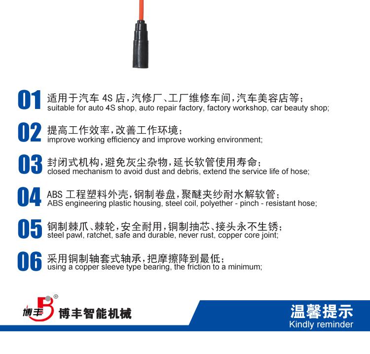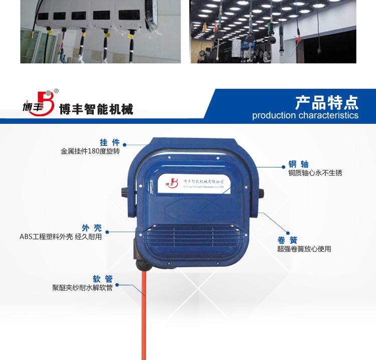 邹平博丰智能机械有限公司专业生产卷线器,卷管器,自动卷管器等产品。主要产品有自动伸缩工作灯系列、自动伸缩排插系列、自动伸缩空气卷轴系列和自动伸缩花园浇灌水管卷轴系列,产品依靠优良的品质及成熟完善的销售网络和服务网点,塑造“博丰”品牌引领国际市场。 邹平博丰智能机械有限公司掀起工作车间环境的新革命**工作环境的新时代。在日常生活中,使用移动的电线、气管、水管拉出和收回时既费时又不方便,给工作和生活带来极大的不便,而且影响工具的使用寿命。如今,工作车间电线、气管等杂乱无章的时代过去来,自动卷管器的出现,使工作车间环境更整洁、美观,使用更方便。目前,“博丰”品牌自动卷轴系列产品已成为众多汽车品牌4S点的“指定使用产品”及“园林绿化浇灌”的**工具。 我们秉承**,诚信合作,顾客满意”的方针,坚持务实的作风,不断创新、扎扎实实、努力拼搏,铸造**品牌。